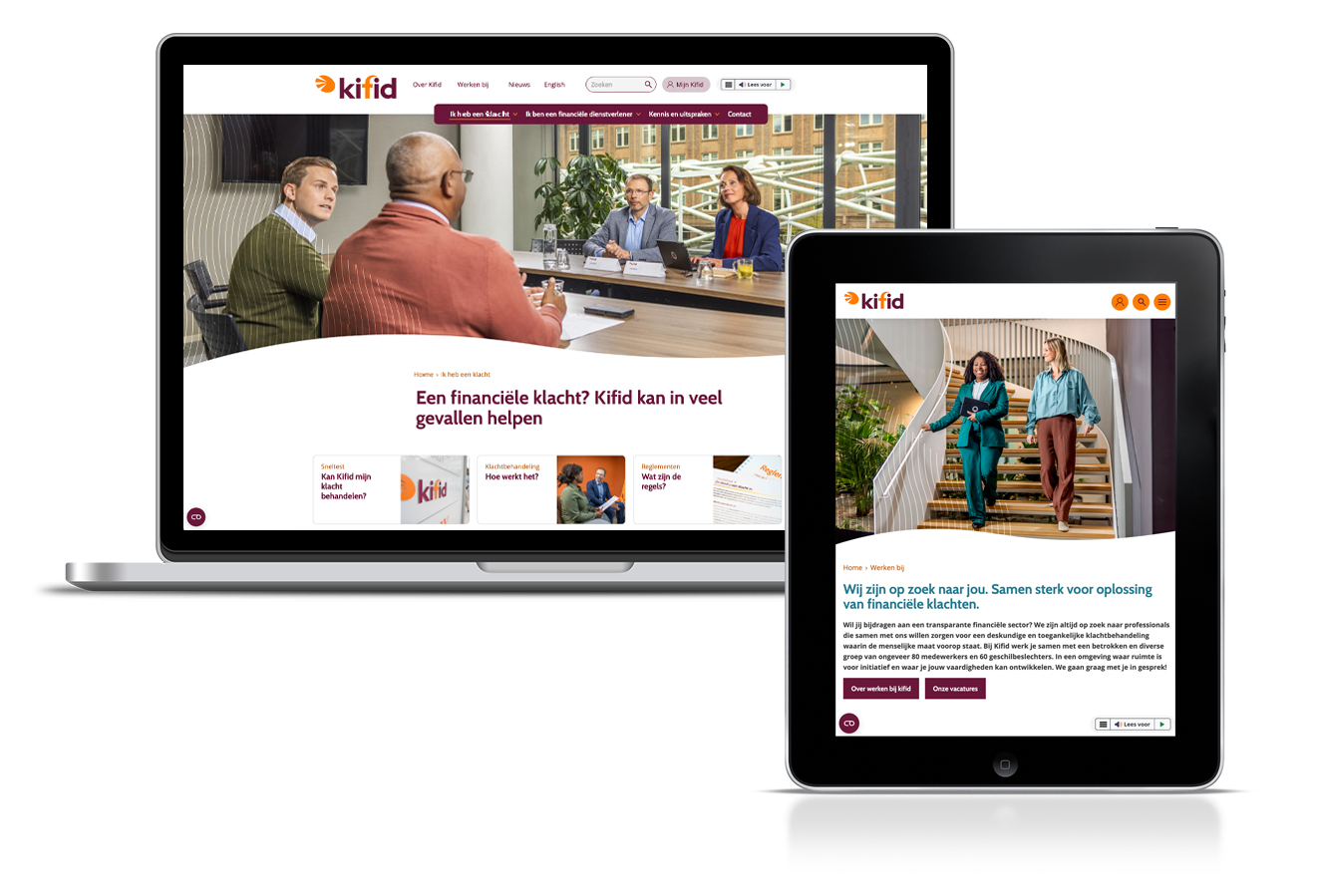 Stichting Klachteninstituut financiële dienstverlening - Kifid - heeft onlangs haar nieuwe website gelanceerd: fris, overzichtelijk en gebruiksvriendelijk. Gloed heeft deze nieuwe website gerealiseerd. Daarnaast hebben we de huisstijl van Kifid zó vernieuwd, dat deze de merkpersoonlijkheid van Kifid visualiseert en voldoet aan de eisen voor onlinecommunicatie. Met de nieuwe huisstijl is de nieuwe website niet alleen toegankelijker, maar ook visueel aantrekkelijker.